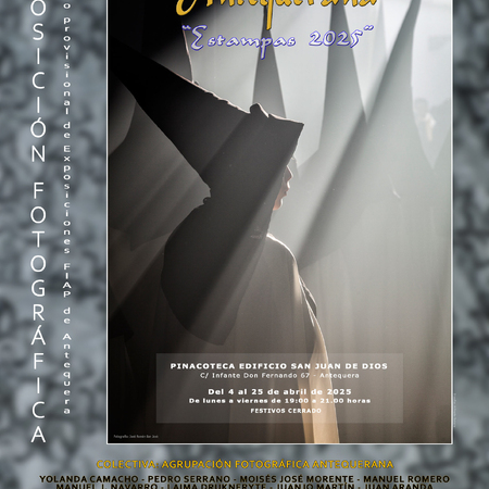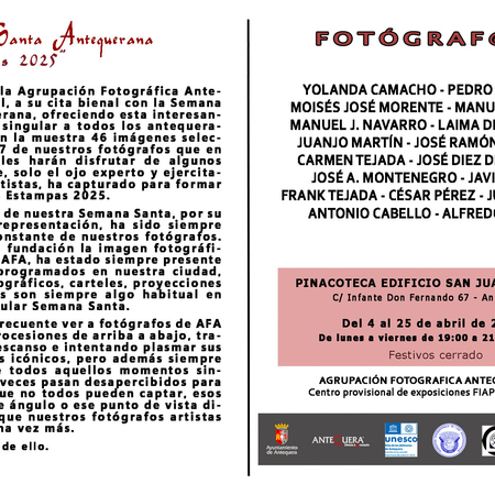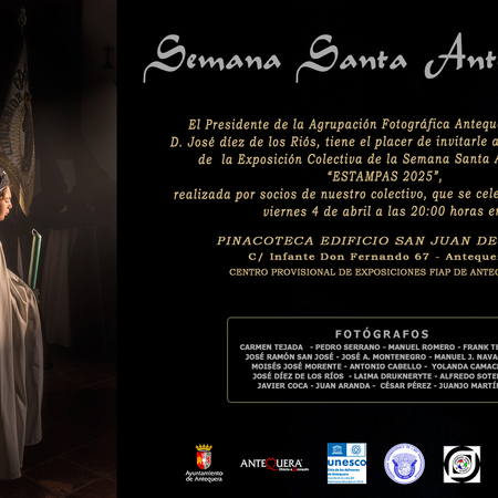 Una vez más la Agrupación Fotográfica Antequerana es fiel, a su cita bienal con la Semana Santa Antequerana, ofreciendo esta interesante exposición singular a todos los antequeranos. Componen la muestra 46 imágenes seleccionadas de 17 de nuestros fotógrafos que en esta ocasión les harán disfrutar de algunos momentos que, solo el ojo experto y ejercitado de estos artistas, ha capturado para formar parte de estas Estampas 2025.