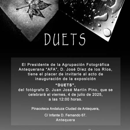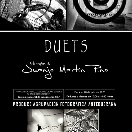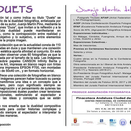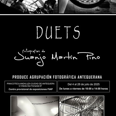 Esta exposición tal y como indica su titulo “Duets” se mueve en el ámbito de la dualidad fotográfica, enfatizada por el trabajo creativo de su autor, Juanjo Martín Pino, mediante la creación de imágenes “Duos”, que invitan a la reflexión y a la interpretación.Esta dualidad puede manifestarse en diferentes niveles, como la contraposición entre realidad y ficción, entre lo objetivo y lo subjetivo, o entre elementos opuestos dentro de la propia imagen.