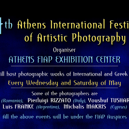 14th Athens International Festival of Artistic Photography The ATHENS FIAP EXHIBITION CENTER organised again this year the international festival of Hellenic Photographic Society through the 14th Athens International Festival of Artistic Photography.