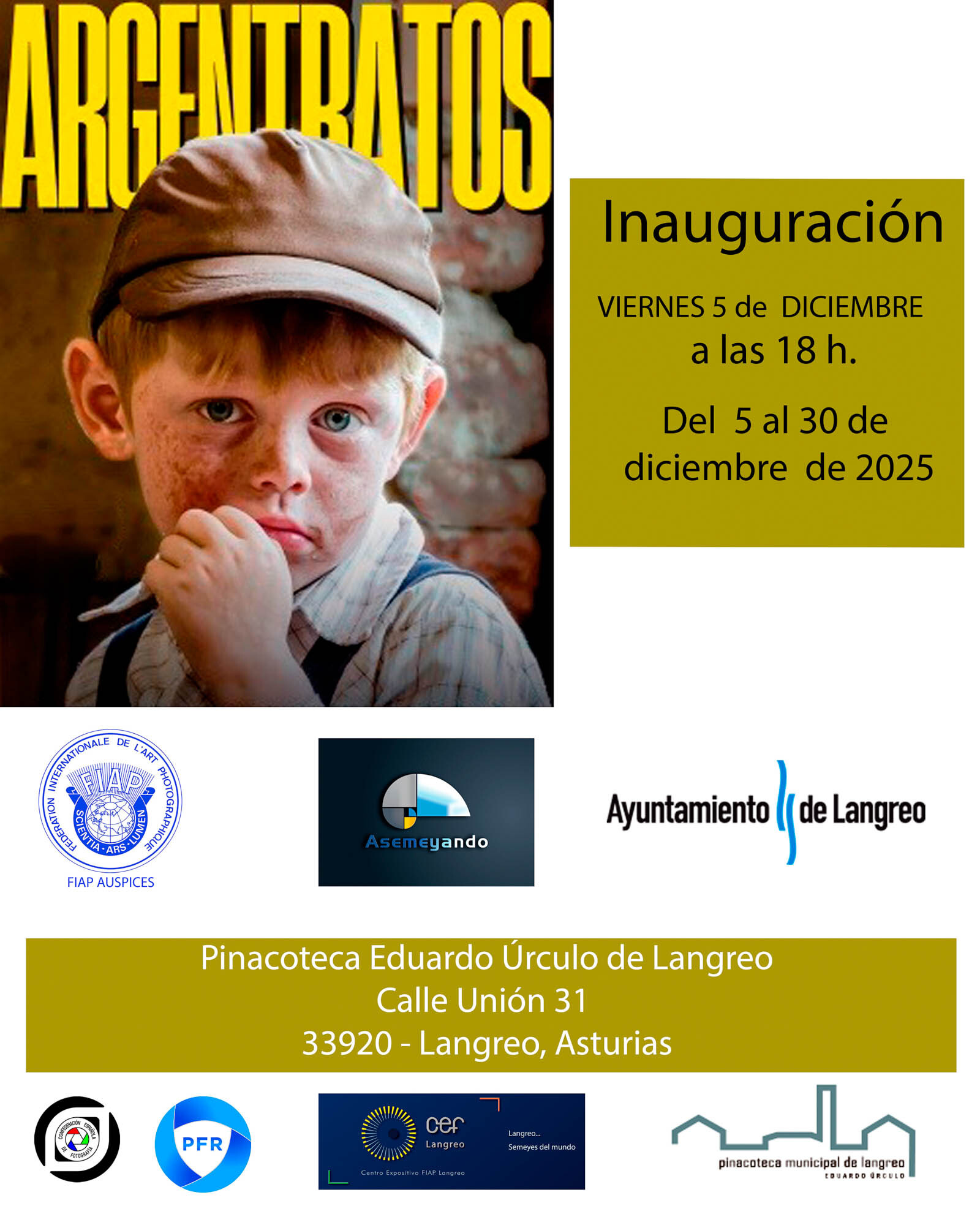 Gracias a la colaboración del CE FIAP El Revellín de Ceuta hemos podido presentar la muestra “Argentratos”. Está constituida por obras con el hilo común del retrato en toda su expresión, los autores pertenecen a la Peña Fotográfica Rosarina habiendo sido la mayoría de las obras premiadas en salones nacionales e internacionales. Nos muestra personas argentinas, sus costumbres y otras marcan el contraste con otras culturas. La intención es mostrar las distintas miradas de los autores y los sentimientos que transmiten a la hora de realizar cada obra. Este año la Peña Fotográfica Rosarina cumple su 75 aniversario, y gestiona un CE FIAP, dispone de sede propia siendo una sociedad sin ánimo de lucro, siendo una de las instituciones fotográficas más decanas del país austral. Rosario está considerada como una de las tres ciudades más importantes y de mayor población del país, ubicada a 300 km de Buenos Aires, la capital. El acto de inauguración contó una vez más con la presencia de la Concejala de Cultura Angelita Cueva Fonseca, mostrando una vez más el apoyo del equipo de gobierno y la corporación municipal a la fotografía en Langreo.
