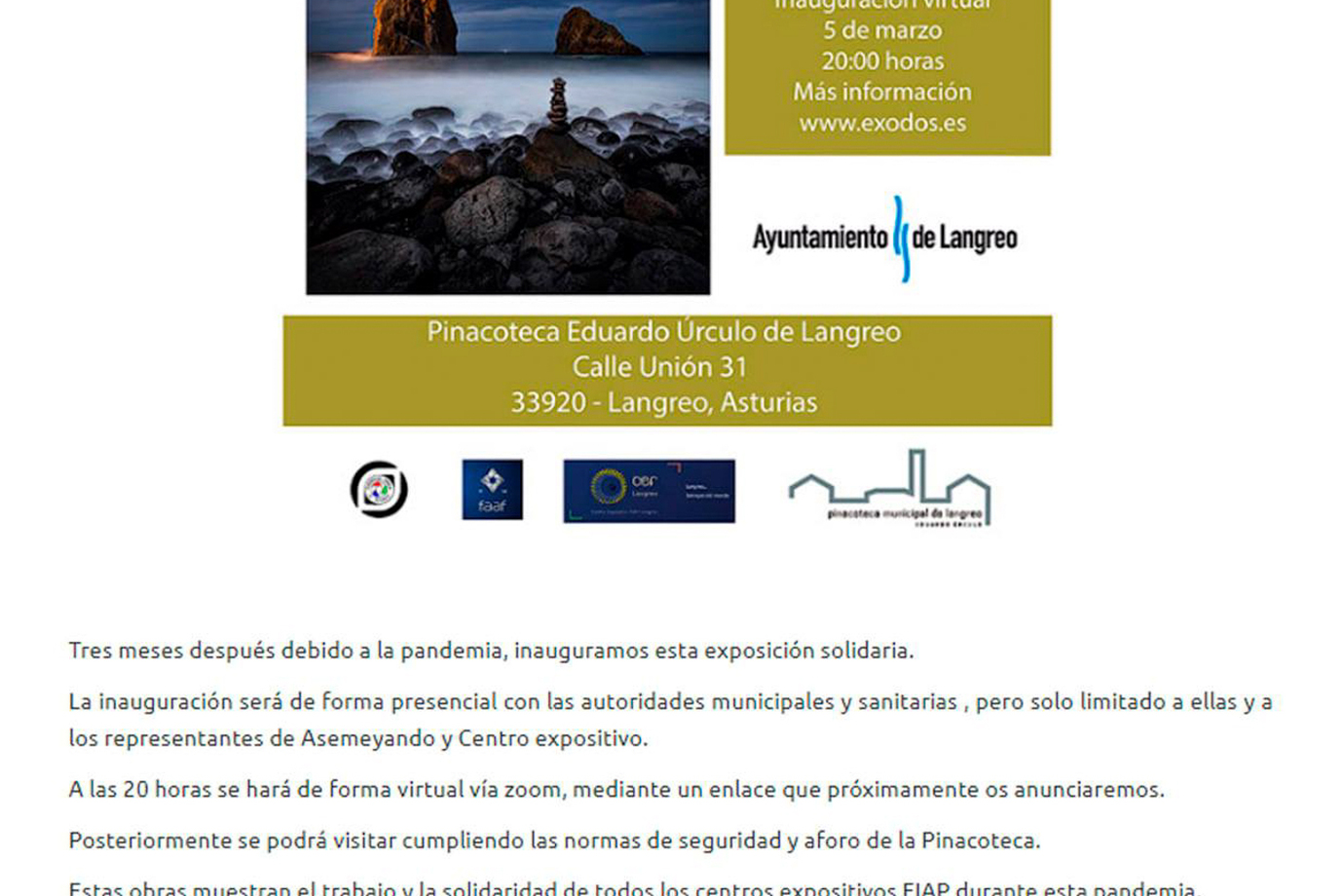 These works show the work and solidarity of all FIAP exhibition centers during this pandemic.Work consisting of 30 photographs, in a 50 X 40 cm format. 254 Will be exhibited in our Permanent Exhibition Center of the International Federation of Photography in Langreo LLangreu Semeyes del mundo / Langreo Photographs of the world)The authors have selflessly donated the works, which will be put on sale at € 50 to raise funds for the Covid-19 campaign that the Asociación Langreana Asemeyando (National Award for the Best Spanish Entity 2019) that supports the FIAP center in Langre.The exhibition will be sponsored by FIAP, which will disseminate this initiative among its one million members and 105 adhering countries.The funds collected will be made available to the Sanitary Area VIII of SESPA