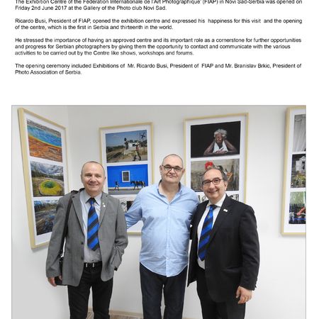 The Exhibition Centre of the Fédération Internationale de l’Art Photographique’ (FIAP) in Novi Sad-Serbia was opened on Friday 2nd June 2017 at the Gallery of the Photo club Novi Sad.