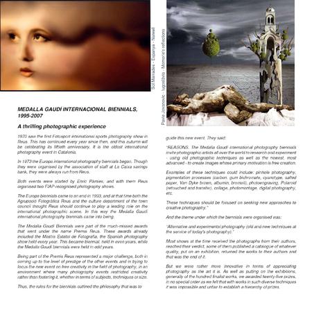 The Europa biennials came to an end in 1993, and at that time both the Agrupació Fotogràfica Reus and the culture department of the town council thought Reus should continue to play a leading role on the international photographic scene. In this way the Medalla Gaudí international photography biennials came into being.