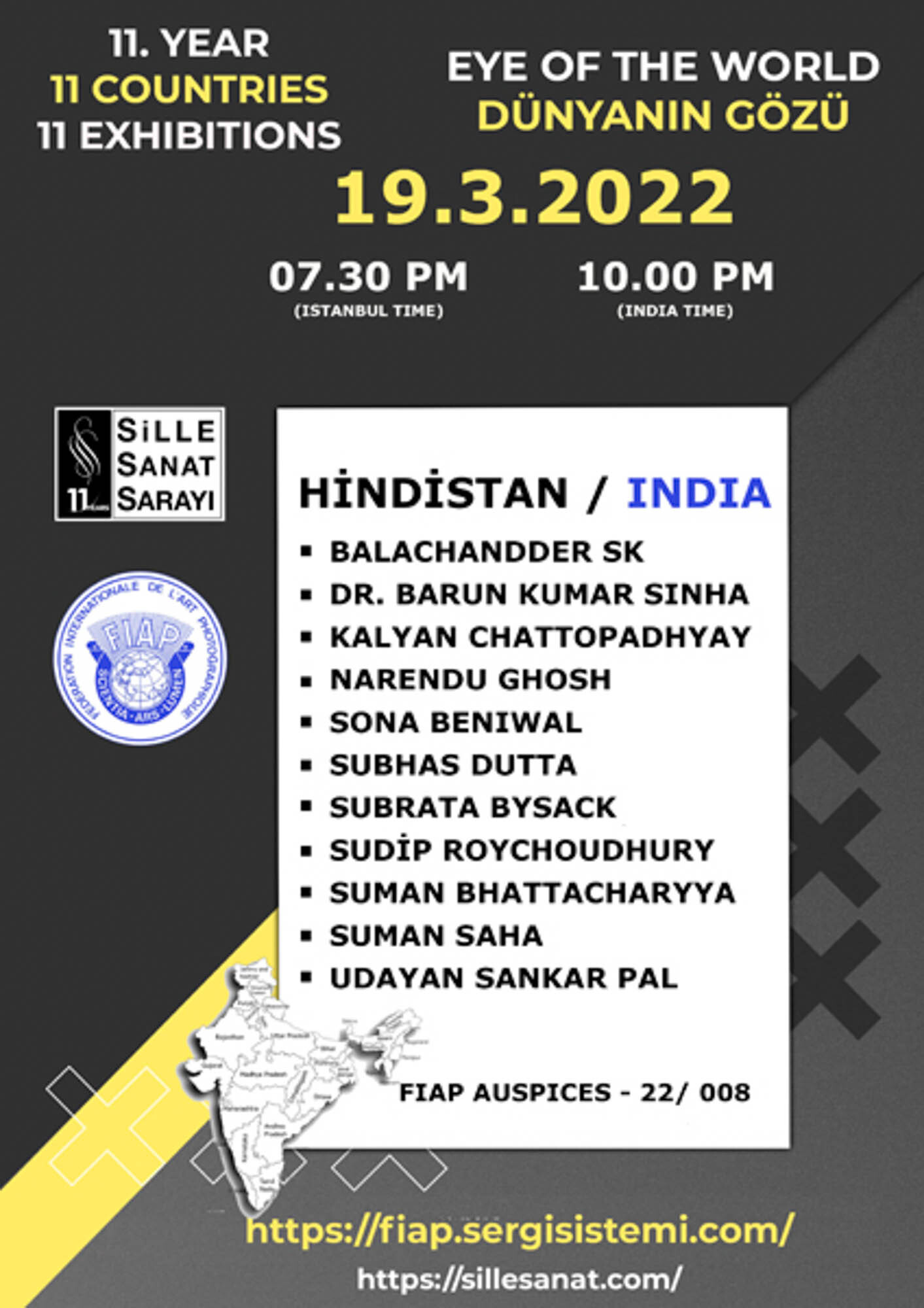 As part of its 11th anniversary celebrations, Sille Sanat Sarayı continues its project “11 Photography Exhibitions from 11 Countries in the 11th Year” with India. This specialinternational initiative aims to bring together the photographic perspectives of artists fromdifferent geographies, creating a strong platform for cultural and visual exchange. The exhibition, featuring works by some of India’s most accomplished photographers, wasopened in Sille Sanat Sarayı’s virtual exhibition hall through an online opening ceremonyheld via Zoom. The exhibition was organized under the coordination of SudipRoychoudhury, Sille Sanat Sarayı’s Country Representative for India, and presents 33 photographs by 11 photographers. Opened with the approval of FIAP Auspices, the exhibition stands out for its internationalrecognition and artistic quality and will remain open in Sille Sanat Sarayı’s virtual exhibitionhall for one year. The participating Indian photographers — Balachandder SK, Dr. Barun Kumar Sinha, Kalyan Chattopadhyay, Narendu Ghosh, Sona Beniwal, Subhas Dutta, Subrata Bysack, Sudip Roychoudhury, Suman Battacharyya, Suman Saha, and Udayan Sankar Pal — shared brief insights into their photographs during the opening and expressed theirappreciation to Sille Sanat Sarayı for organizing this meaningful international event. The exhibition can be visited online for one year via the link below: https://fiap.sergisistemi.com