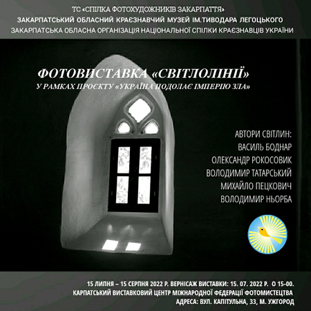 On the 15th of July, on the eve of the 32nd anniversary celebration of the Declaration on State Sovereignty of Ukraine, Photographic Art Association of Transcarpathia has presented in the Carpathian FIAP Exhibition Center the photo exhibition «Light lines». The exhibition presents the works of five photographers: Vasyl Bodnar, Oleksandr Rokosovyk, Volodymyr Tatarskyi, Mykhailo Petskovych and Volodymyr Norba (AFIAP). The participants of the exhibition opening have noted that «the lines of the light» are the lines of human life, which is the highest social value, guaranteed by the Constitution of Ukraine, they also characterized their works showed in the exposition. Mykhailo Petskovych: «The exhibition presents my photos from the album with the telling title «Travel Interrupted by War». So, viewers will be able to mentally return to a lost peaceful state and as a result to dream and plan their future». Vasyl Bodnar: «I think that visitors have to pay attention to the titles of the exhibited works, like «Severed bonds», «To the light», «Found state» and others. Perhaps the process of perceiving and analyzing both individual works and the entire exhibition will encourage viewers to give their own names to the pictures».