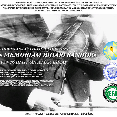 Creative Union «Photographic Art Association of Transcarpathia» within the framework of the project of The Carpathian FIAP Exhibition center «Golden Collection of the World Photo Postcards»» has opened on the 30th of March in Chinadiiovo Castle «Saint Nicholas» the exhibition «In memoriam Bihari Sandor». Photo exhibition was presented in newly created gallery «The Gallery of One Picture». As the author of the photos, Stefan TÓTH István A.FIAP, ESFIAP mentioned during the exhibition opening: «I am grateful forthe opportunity to present my photography as a part of this interesting project. Thecooperation between the two FIAP centers, FIAP Exhibition Center Oradea (Romania) andFIAP Exhibition Center The Carpathian (Ukraine), continues. Our initiative also launches a new collaboration between two castles in the Carpathian region – Oradea Castle (Romania)and Chinadiiovo Castle «Saint Nicholas» (Ukraine)».