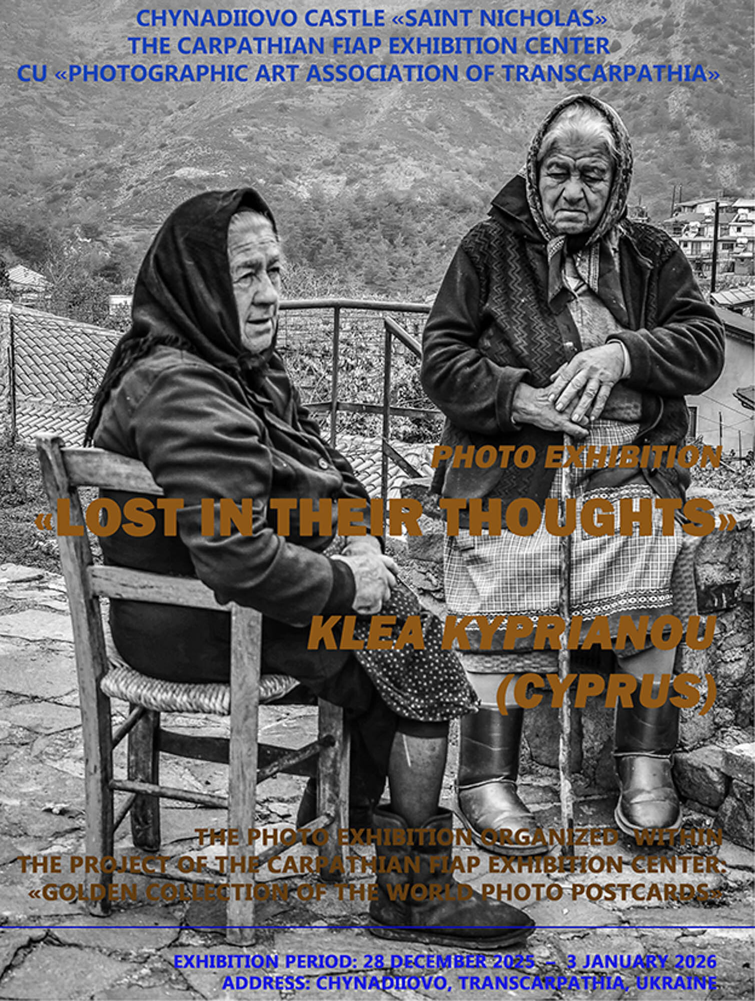 Creative Union «Photographic Art Association of Transcarpathia» within the framework of the project of The Carpathian FIAP Exhibition center «Golden collection of the world photo postcards» has opened in Chynadiiovo Castle «Saint Nicholas» the photo exhibition of Klea Kyprianou, EFIAP/D3 (Cyprus) «Lost in Their thoughts». A photo exhibition by a famous Cypriot artist was presented at the «Gallery of One Picture».