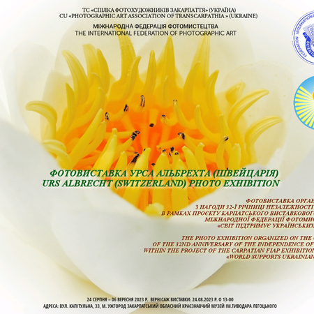 CU «Photographic Art Association of Transcarpathia» (Ukraine) has presented on the 24th of August in The Carpathian FEC the photo exhibition by Prof. Dr. Urs Albrecht (Switzerland). The cultural and artistic event was held on the occasion of the 32nd anniversary of the Independence of Ukraine, within the framework of the project of the Carpathian Exhibition Center of the International Federation of Photographic Art «The World Supports Ukrainian Artists». The exposition is represented by 37 photographs of the author created over the past five years. In total, Urs received оver 100 medals and awards in international salons during his creative career. The photo exhibition of the titled Swiss photo artist, who is, in particular, a member of the American Photographic Society (PSA), the International Union of Photographers (IUP), the Royal Photographic Society (RPS), is held under the patronage of the most respected photographic organization in the world – the International Federation of Photographic Arts (FIAP).
