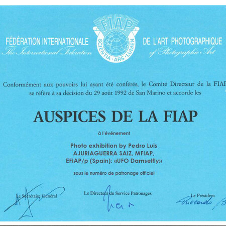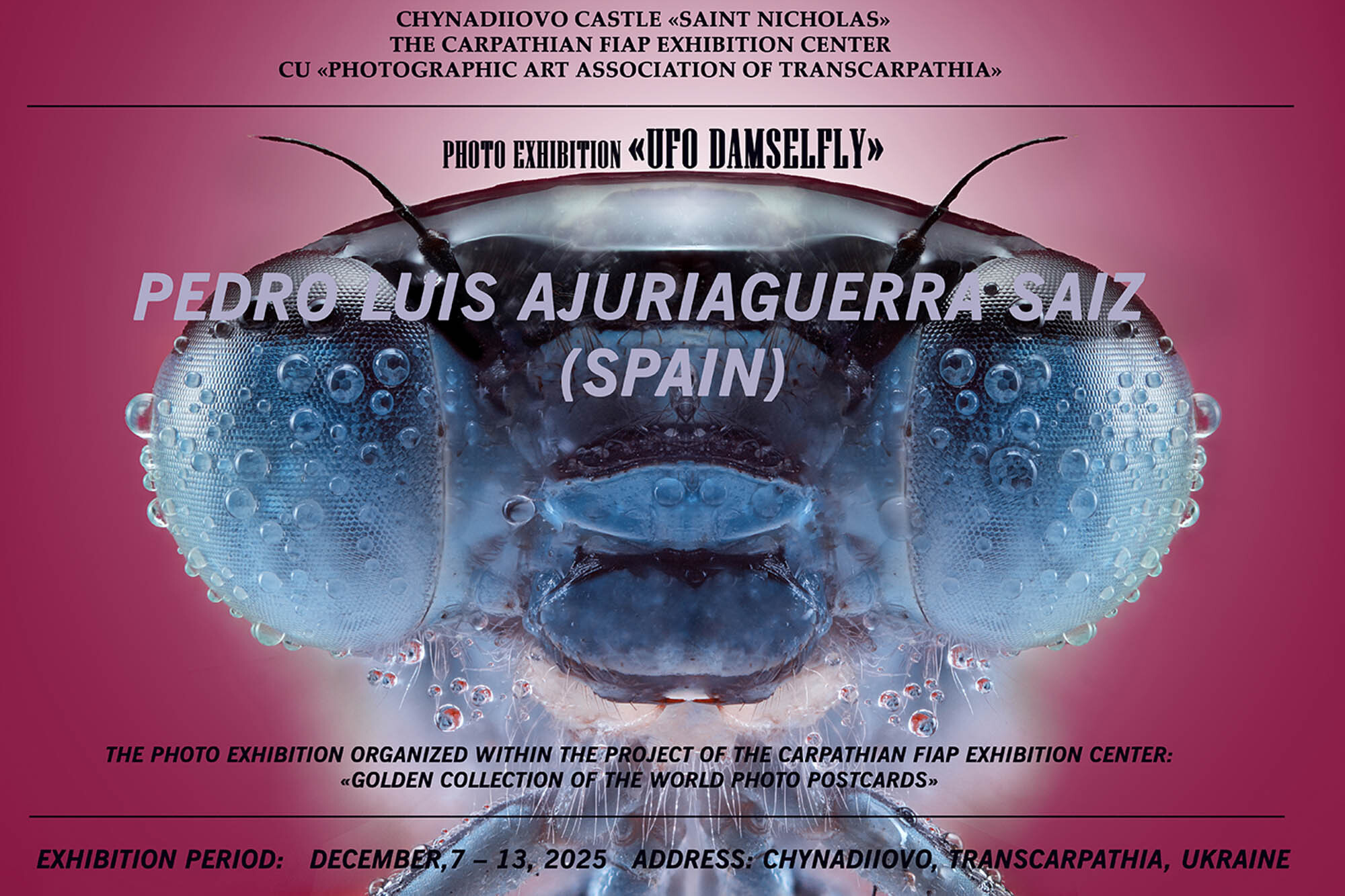 Creative Union «Photographic Art Association of Transcarpathia» within the framework of the project of The Carpathian FIAP Exhibition center «Golden collection of the world photo postcards» has opened on the 7th of December in Chynadiiovo Castle «Saint Nicholas» the photo exhibition of Pedro Luis Ajuriaguerra Saiz, MFIAP, EFIAP/p (Spain) «UFO Damselfly». A photo exhibition by a famous Spanish artist was presented at the «Gallery of One Picture».
