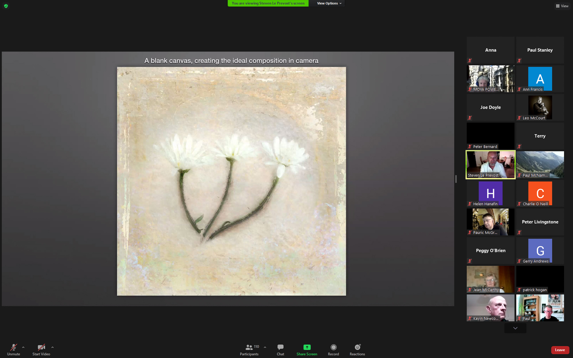 The FIAP Exhibition Centre in Dublin was very pleased to present this special evening with Steven Le Prevost on 1st June 2021. We had 115 members and guests attending the event which took place using the Zoom platform due to the current Covid restrictions which apply in Ireland.