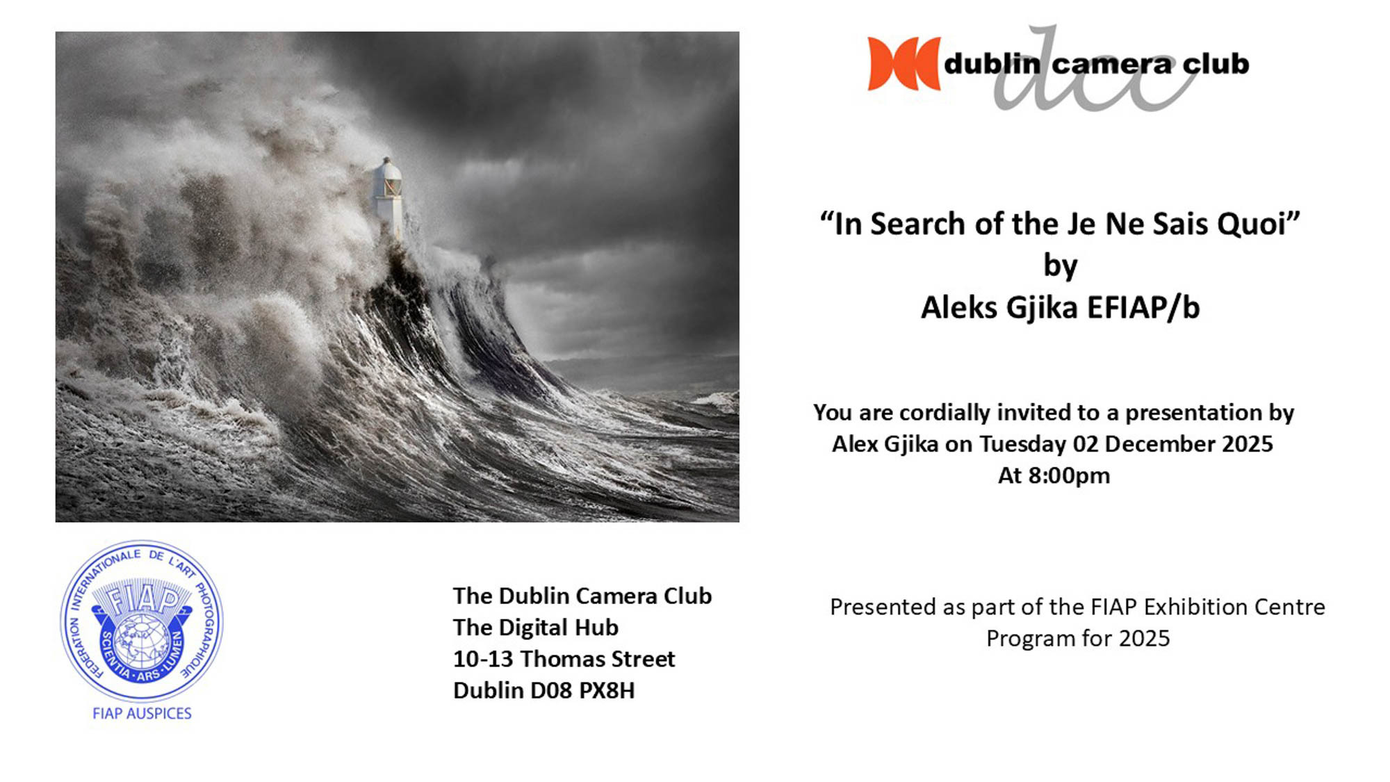 On 02 December 2025 the FIAP Exhibition Centre Dublin presented its final item in the FEC programme for 2025. It was a digital presentation by Alex Gjika who joined our members in our clubhouse and those at home via Zoom. We had a large number present and all enjoyed Alex’s wonderful and inspiring images.