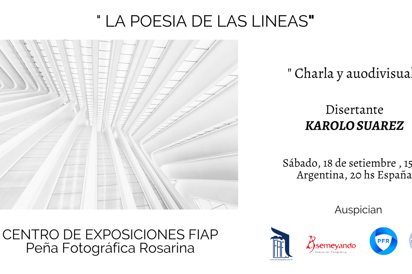 Last Saturday, September 18, the audiovisual and talk "The poetry of the lines" was held, where we had the presence of the Spanish photographer, Karolo Suarez from the city of Oviedo, Asturias region and belonging to the Asemeyando Photographic Association.