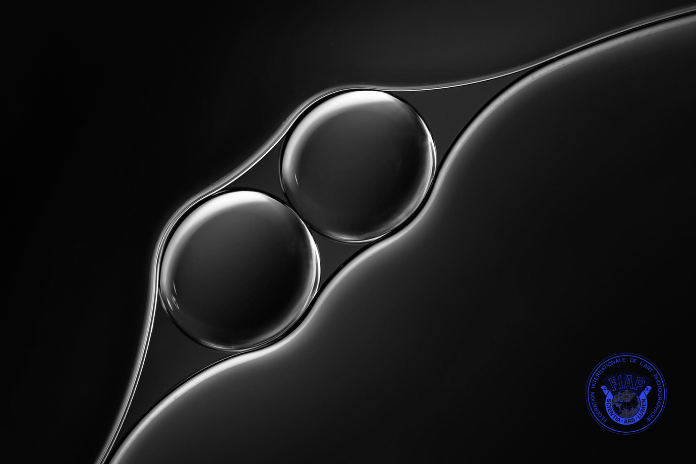 I am showing in this series that liquids that don’t normally mix can, in fact, be controlled. The compositions or arrangements can be created in the form of both static and motion shots. Oil droplets will remain circular unless deliberately moved. Motion images are captured by freezing the action with flash. Control is also used regarding choice and placement of the lighting and background for the bubbles. These are adjusted according to the arrangement or predicted location of the oil moving on water. This control allows an infinite variety of close-up views, which wouldn’t normally be seen, into the mysterious world of liquids.